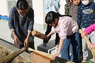 午後は、いよいよ待ちに待ったもちつきです。地域の方や保護者の皆様にご協力いただき、「ペッタン、ペッタン」と元気な音を響かせながら交流を深めました。重い杵(きね)を一生懸命に振り上げ、臼(うす)を使って自分たちでついたおもちの味は、きっと格別だと思います。