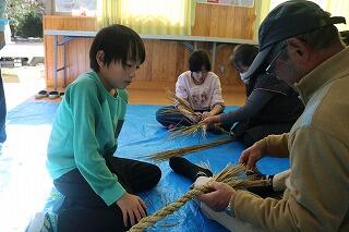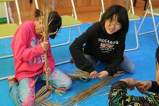 12月22日(月) 全校児童でしめ縄作りを行いました。当日は地域の方7名にお越しいただき、講師として作り方を丁寧に教えていただきました。