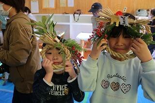 しめ縄づくりは、わらを水で濡らした後、木槌で叩いて柔らかくし、編み上げていきます。仕上げに、裏白(うらじろ)や南天、稲穂などを飾り付けると、それぞれに個性豊かなしめ縄が完成しました。最後はみんなで笑顔の記念撮影!