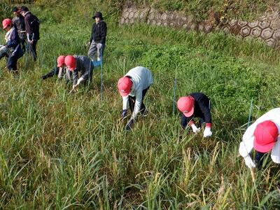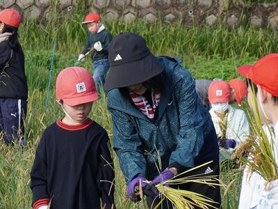 稲刈りが初めての児童もいましたが、みんなで鎌を器用に使いながら、取り残しがないように丁寧に刈り進めていきました。