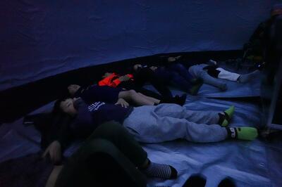 体育館に設置された丸く大きなドームの中へ。全員で、投影機の周りに敷かれたマットの上にぐるりと横たわり、いよいよ星空が映し出されます。