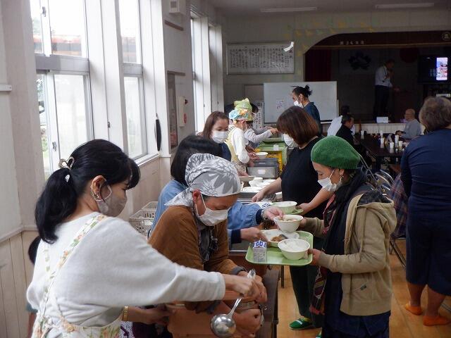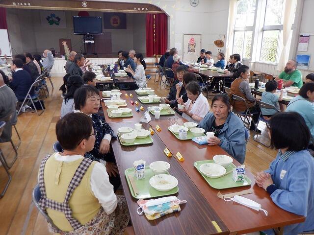 吉之元フェスタの終了後に地域の方・保護者との給食交流会を集会場で行いました。参加していただいた地域の方と保護者、合わせて46名が参加してくださいました。職員と児童を合わせると61名での給食です。