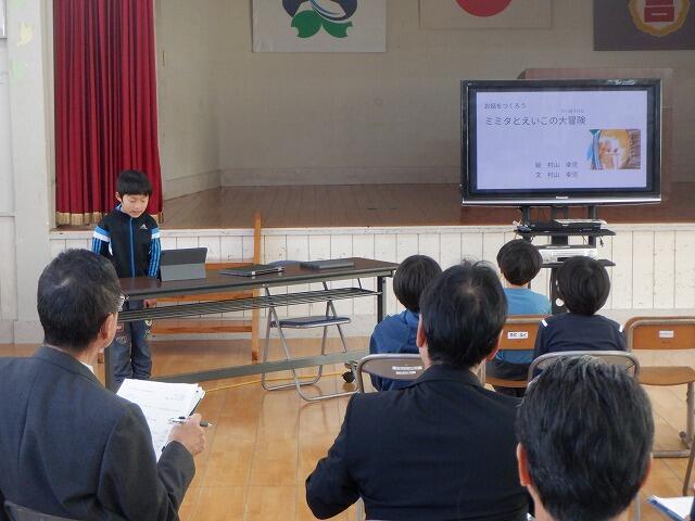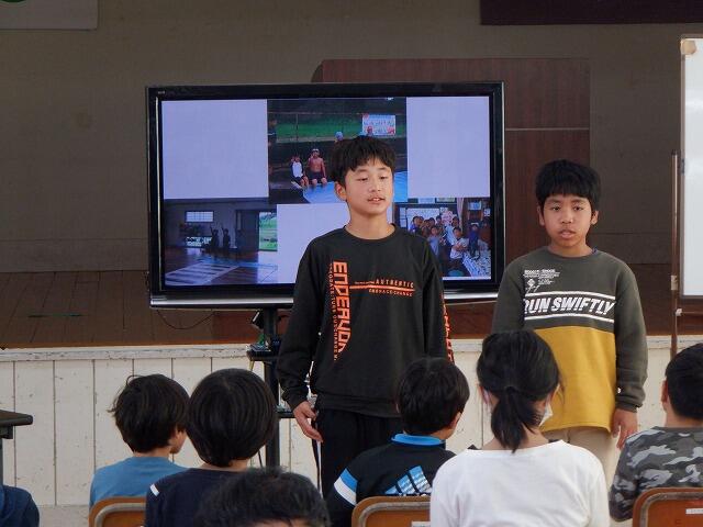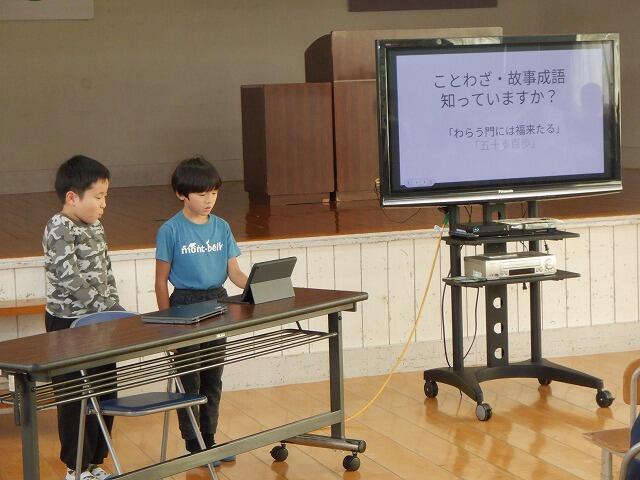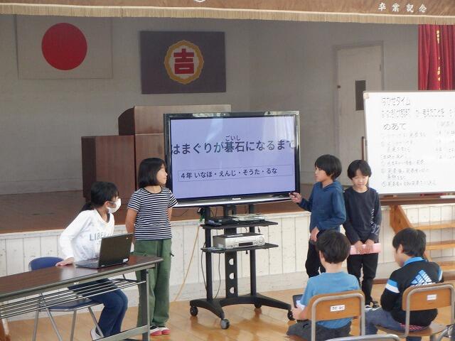 まず、4年生は社会科で学習した「はまぐり碁石ができるまで」について、発表しました。6年生は、総合的な学習の時間の「トモダチふやそうプロジェクト」について、発表を行いました。各学年とも調べた内容を上手にスライドにまとめて発表することができました。