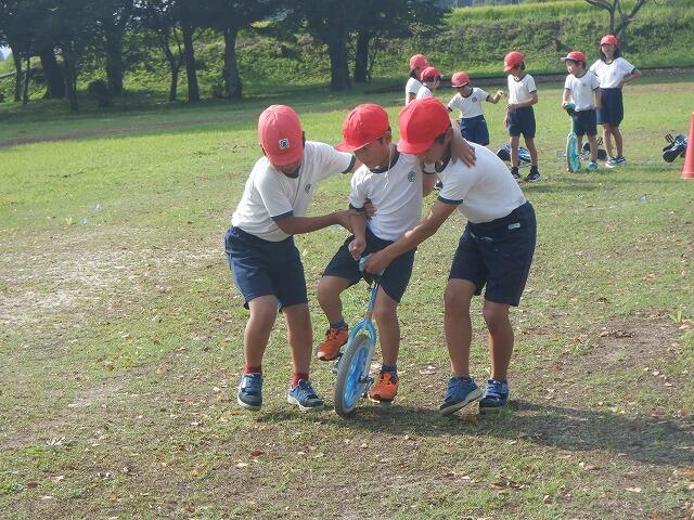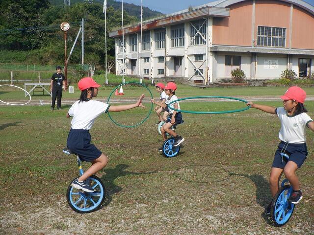 全校演技では、一輪車の演技を披露します。本日は、運動場での初めての練習でした。これまで一輪車の練習は、体育館で行ってきたので、地面が平らでない分、慣れるのが大変でした。本番で、いい演技ができるように全員が頑張りました。 Practicing unicycles is a lot of fun.