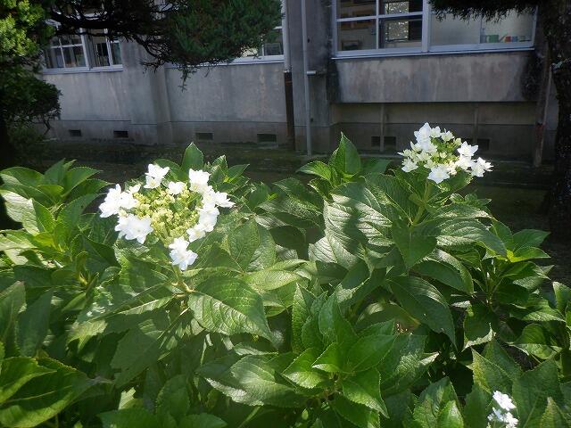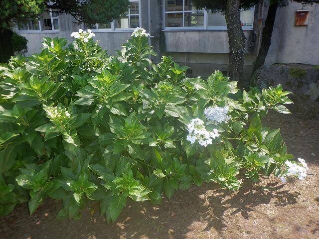 学校の玄関横にあるアジサイです。校内に植えてあるアジサイには,花がついていないのですが、ここにあるアジサイだけ花がついています。不思議です。