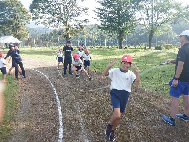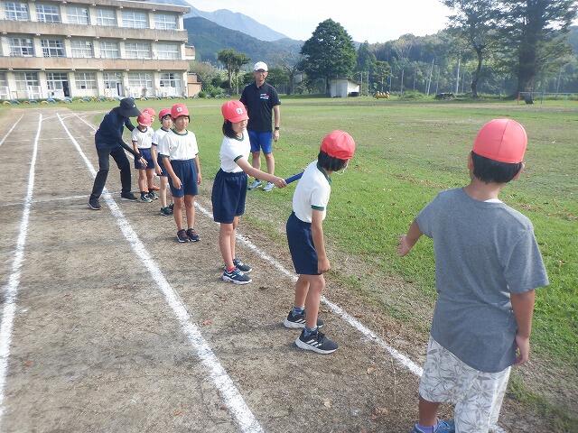児童の種目の最後は、全員リレーです。9名の児童がバトンを繋いで記録に挑戦しました。練習で出した記録を上回って、ゴールすることができました。全員大喜びでした。