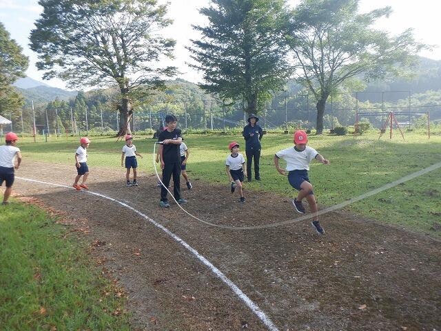 その次は、長縄跳びの練習を行いました。本番では、児童全員が八の字跳びで1分間に何回跳べるか、その回数に挑戦します。ちなみに本日の記録は、20回でした。