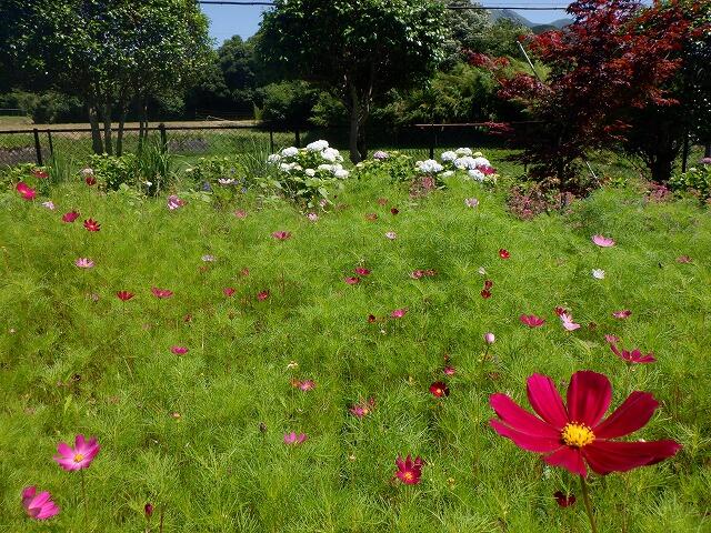 この写真は、6月に撮った写真です。アジサイと一緒にコスモスの花が映っています。