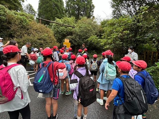 出発式では、西岳小の松田校長先生からお話があり、8時20分に出発し、午前中は、三股町の長田にある「しゃくなげの森」を見学します。