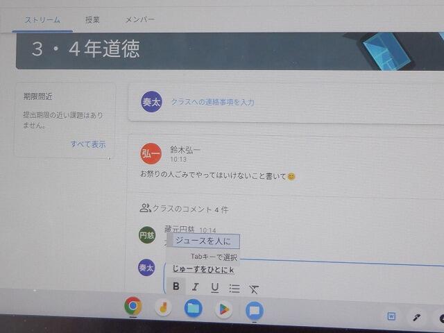 道徳科でのタブレットの活用です。Googleのクラスルームを活用して、教師の発問に対して、子どもたちが自分の考えを打ち込んでいきます。