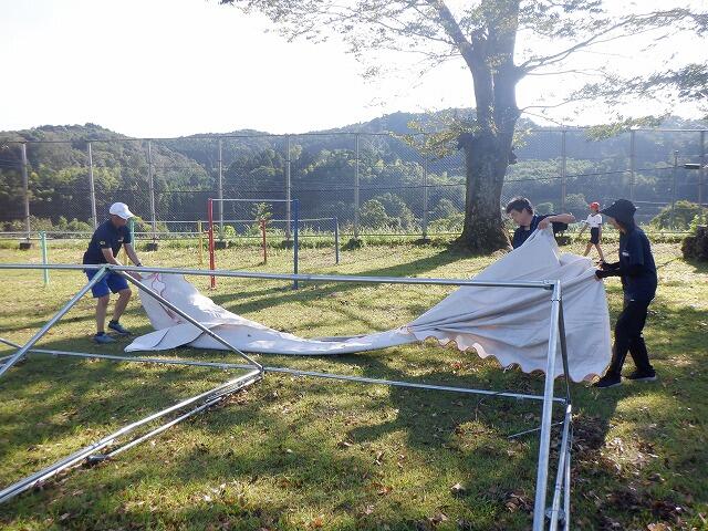 子どもたちが枝拾いをしている間に運動会用のテントを設営しました。