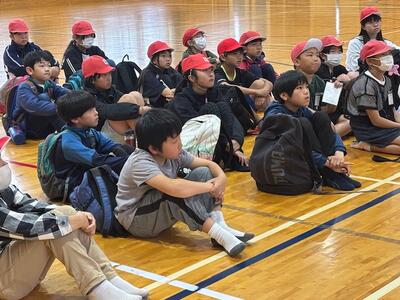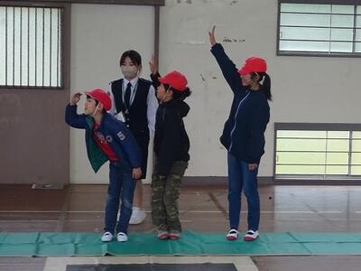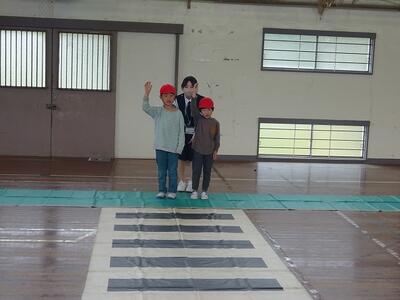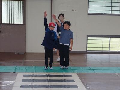 お話の後は、実際の横断歩道に見立てた道具を使って、正しい渡り方を復習しました。
