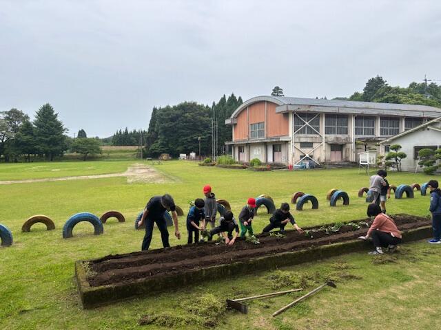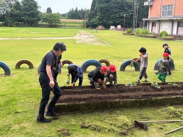 地域の方からいただいた100本近い苗を全校児童で植え付けました。花壇を掘りおこし、うねを作ってから等間隔に穴をあけます。できた穴に、苗をななめにさして、優しく土をかぶせました。地域の方のおかげで、またとない貴重な経験ができました。収穫が楽しみですね!