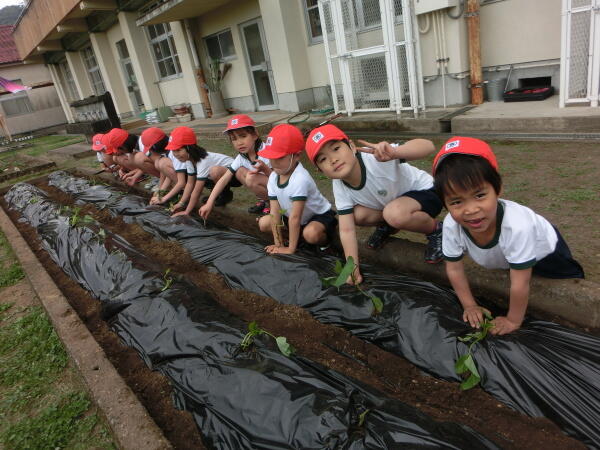 校舎の南側の花壇と体育館の南側の畑に芋の苗を植えました。