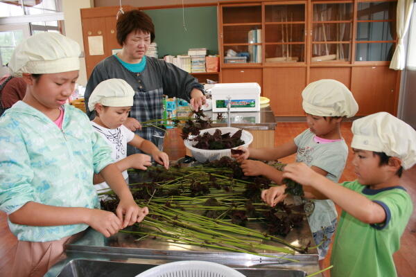 今里さんがたくさんの赤しそをもってきてくださり、みんなで一生懸命もみました。