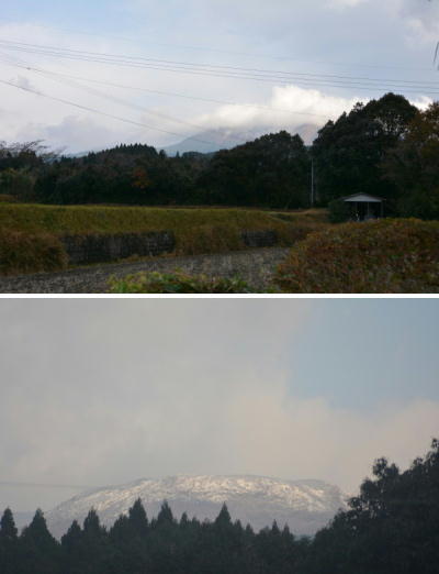 先日から寒くなったなあと思っていましたが、とうとう今朝、高千穂峰に白く雪がかぶっていました。