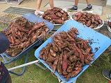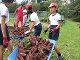 子どもたちもどんなイモができているか楽しみの様子です。今日(10月16日(火))の午前中に芋掘りをしました。たくさんのイモを収穫することができました。中には、1年生の顔の大きさぐらいのイモもあり、びっくりしていました。