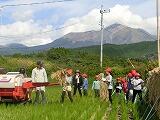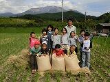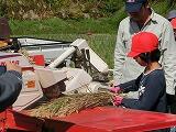 掛け干しした稲を脱穀機にかけて、3俵のもみがとれました。精米すると約70kg程度の餅米ができるのではということです。