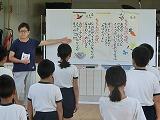 児童ホールの表現広場に貼っている今月の音読のことばは「ちちんぴいのぱっ ちちんぷいのぽい(ぐりとぐら)」です。今月の音読のことばを作って貼ってくださった堂園先生が、お話集会で内容の説明をし、児童みんなで音読をしました。