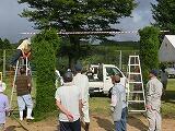 入退場門は、毎年地域の方々が作ってくださる「杉の門」です。手慣れた作業で、きれいなすばらしい門ができあがりました。入退場の看板は、明日の朝飾られます。