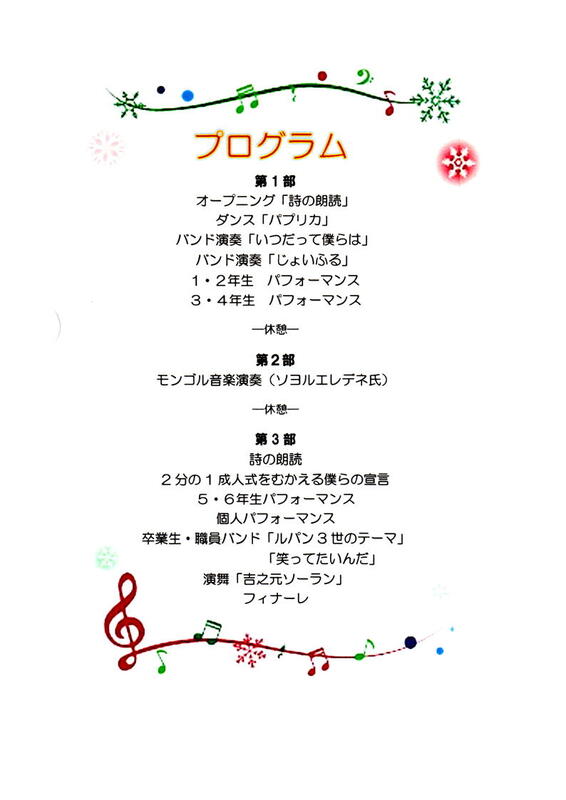 12月8日(日)、吉之元小学校「音郷フェスタ」を開催しました。冬晴れのとても良い天気になりました。体育館の中は少々寒いですが、ストーブを焚いて暖かくし、地域の方や保護者、その他多くの方々を迎えました。9時30分開演予定でしたが、8時30分頃には地域の方々が来られ始めました。予定時刻には、体育館一杯にお客様が入られ、子どもたちも少々緊張気味です。