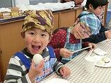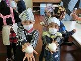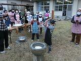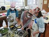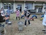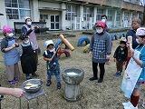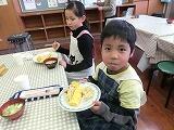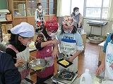 ご飯は、持ち寄ったお米を炊飯器で炊いたものを一人一人自分用におにぎりにしました。おかずの卵焼きも、一人一人が卵を割り、ボールでかき混ぜて塩や砂糖を入れて味付けしたものを、自分用にフライパンで焼きました。うまく卵を割れなかった児童がいたり、砂糖を入れすぎて焦げ目がついたりした児童もいましたが、ほとんどの児童はうまくおいしそうに焼き上げていました。先生方が作ってくださった「がね」の材料のいもは、学校で採れたものです。砂糖をほとんど使わずに塩だけでの味付けでしたが、いも本来の甘みで、とってもおいしい「がね」ができあがりました。