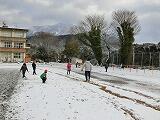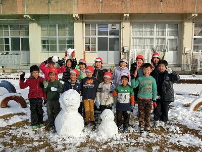 2月18日(火)朝は、昨夜からの雪で校区内中が真っ白です。朝のボランティアを終えた子どもたちは、跡一つ無い真っ白な運動場に出て、背丈ほどもある雪だるまを作ったり、団子にした雪を空に放り投げたりして、楽しく雪遊びをしました。校庭の真ん中では約5cmの雪が積もっていました。