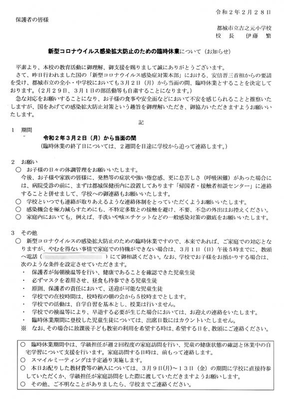 ◎ 新型コロナウイルス感染拡大防止のための臨時休業についてのお知らせです。