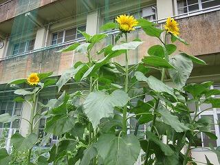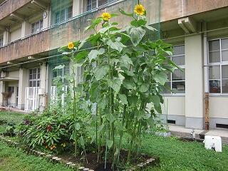 7月8日は個人的に大好きな日で、勝手に「七転び八起きの日」だと決めています。今回は、先日掲載したひまわりの知られざる復活劇を紹介します。これは、ほとんどの人が知りません。写真中央の1本は10日ほど前、強風のため完全に「はんとけた」のです。根元から90°に折れて曲がって倒れました。すぐに支柱を立てて起こしましたが、無残にも2日後再びはんとけました。しかし、3・4年生担任が諦めませんでした。ダメだろうと思うのが普通ですが、乾先生は違いました。支柱を2本に増やして根元に土も補給して、そして、天に祈りながら懸命に花命救助したのです。その甲斐あって、今では見事に開花しました。背丈もあの時より更に30㎝ほど伸びてゆうに2mを超えています。またまた、ひまわりから「七転び八起きの奇跡」を学び、感動させられ、エネルギーをもらいました。深謝いたします。心から、あいがとがした。