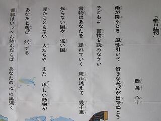 読書に良か季節です。そんなこともあり、10月になって西条八十作「書物」という詩の暗唱に挑戦しているところです。「雨が降るとき風邪引いて 好きな遊びが出来ぬ時 子どもよ書物を読みなさい・・・」という7・5調リズムはとても音読し易く、今月中旬までにほとんどの児童が見事な暗唱を披露しました。
