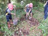 カライモ植えでした。重宝したのが切った竹の枝です。切り口にイモの苗を挟んで土中に埋め込むのに、ピシャッちしたヨカ道具になりました。張ったマルチの上からの作業なので、これがあるとほんのこち便利でした。前もってビニールをつんぬくって穴を開け方でした。そん時もこの竹1本で十分でした。児童には、大げさですが、人類の知恵として、こうしたこともしっかりと学んでもらえると嬉しい限りです。お忙しい折に、苗を手配してくださった田畑利紀様と門松一男様に御礼申し上げます。ありがとうございました。