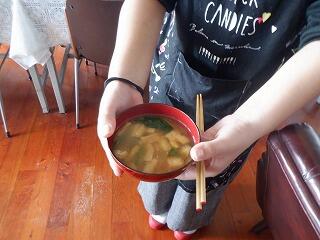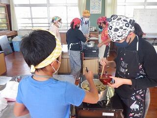 写真は5・6年生の家庭科で味噌汁を作ったとこです。でけたてホヤホヤをいただきました。ヨカーかざがした上に、揚げオカベやらカライモやら、具がどっさい入って、うんめもうんめ かったっです。ざこの出汁も、じっぺ効いちょる ゼータッな味噌んしゅい でした。ごっそー様でした。