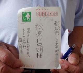 7/4(火)参観日には、地域からもどっさい参加していただきました。西岳小・中学校との3校学校運営協議会も同時開催したためですが、雨の降る中での多くの方の御来校に改めて感謝申し上げます。ありがとうございました。写真は、学校下の松原さん宛ての案内ハガキです。児童が手書きでてねーんして書いて送った物です。大切に保管して持参してくださる程、喜んでおられました。