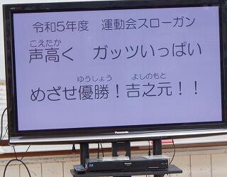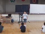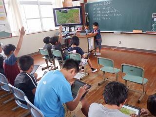 1学期の学習内容を一人一人が発表しました。写真は1・2年生の発表場面です。学校内で撮影した写真をパソコンに取り入れ、それをモニターに映しています。そして、上学年一人一人のタブレットに画像送付をすると同時に、作成したオリジナルクイズを出題しているところです。1・2年生としては、とてもハイレベルな発表だったと思います。他の児童も、全員それぞれがよく考え、工夫した発表をすることができました。「あっぱれー」があげられると思いました。アウトプット(発表)するのを、げんねがっていた我々の昔とは雲泥の差を感じてしまう、そんな時代が正に今だと実感したところです。