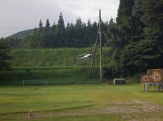 早朝に運動場横の田んぼにリモコンヘリでの農薬散布がありました。夏休み直前になり、同じような風景を見ながら夏休みが始まるぞと、日々わくわくしていた小学校時代を思い出します。昔は有人のふっとかヘリでしたが、今は無人です。グランドでは、ニャンコ先生も出て来て、何事か?と無人ヘリを珍しそうに見守っていました。