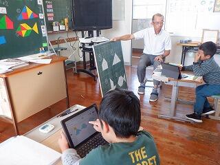 1・2年生の算数で、1年生が「かたちづくり」2年生が「三角形と四角形」を学習しました。学習内容は別々ですが、これを同じ時間に指導するのが複式学級の至難であり、正に「言うは易く行うは難し」です。このため、本時までに担任は様々な準備を入念にしてきていました。特に、2人それぞれのPCタブレットを工夫して活用し、学習意欲を高めながらの展開をすることができました。さすがベテランの授業でした。複式指導は、思った以上に、むかしもむかしぃ事なのです。