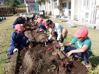 米作り活動が終盤となり10月最終日の今日は、いねこっ でした。手作業でしたが、昔の最新型足踏み回転脱穀機で、掛け干ししていた稲の穂が、じっぺ収穫でけました。後は精米工程が残っていますが、上等な もっ米 がゲットでけそうです。その後、引き続きからいも掘りをしました。採れたのは、べーんこしたみごちぃ色で、いかにも、うんめかろそなカライモでした。御支援いただいた保護者の方々に感謝申し上げます。そして、大自然の豊かな実りにも深く感謝いたします。ありがとうございました。