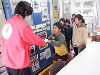 児童は歳末助け合い運動に参加しました。集めた募金を、福祉協議会の方に受け取っていただいたところです。全世界の人々が幸せになることを、みんなで祈っています。
