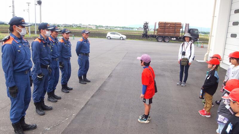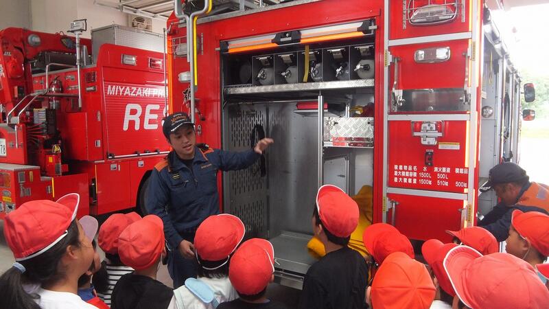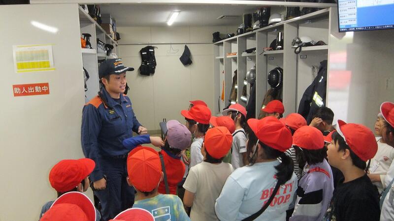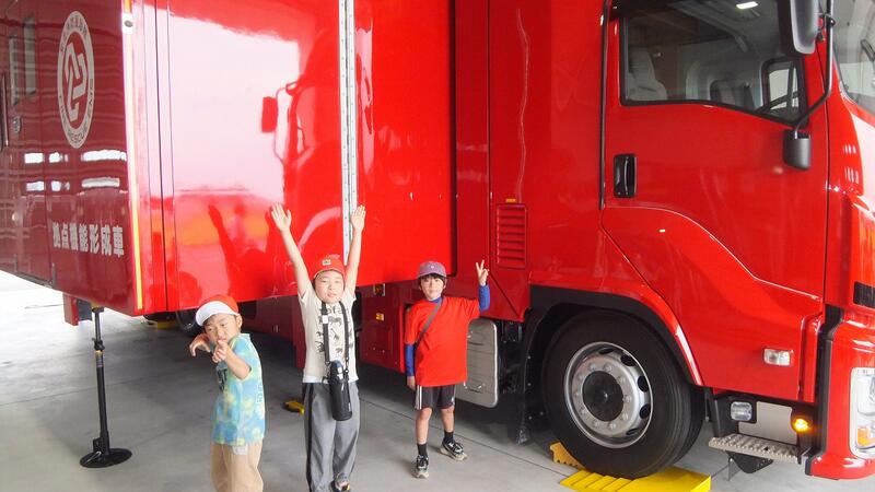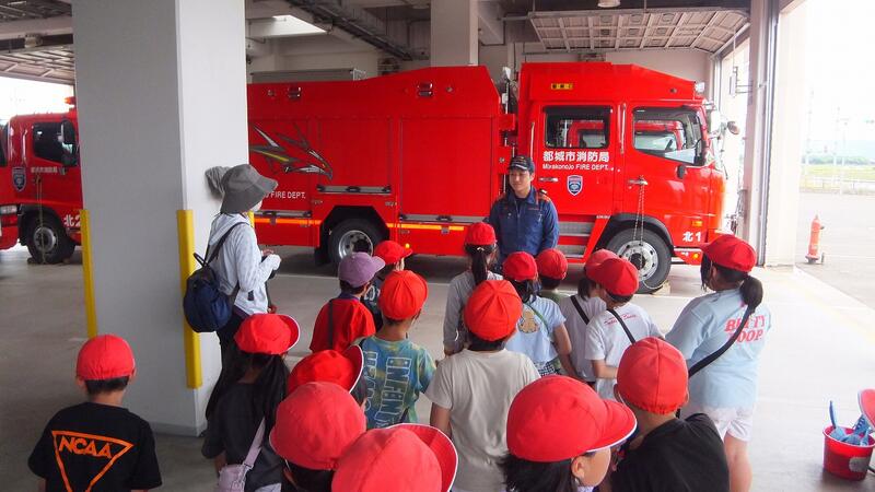 北消防署では、消防署の施設や消防車、指揮車などを見学しました。