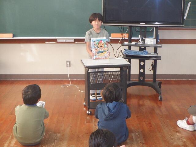 今日の朝の活動は、お話集会でした。集会では、2・3年生が自分が読んだ本の紹介を行いました。