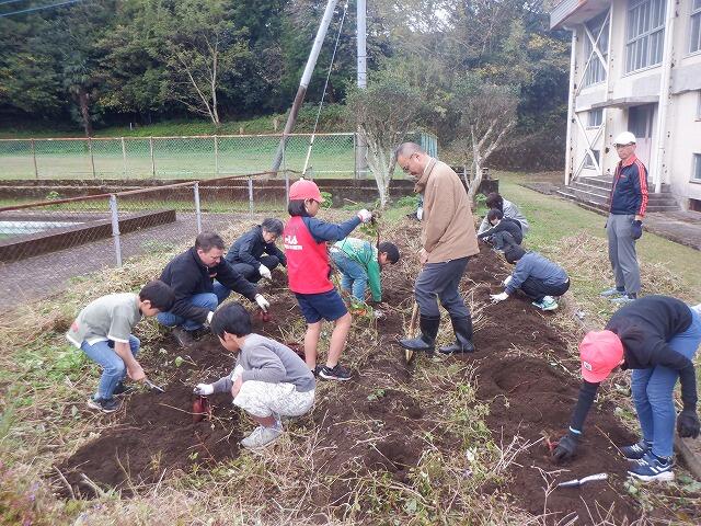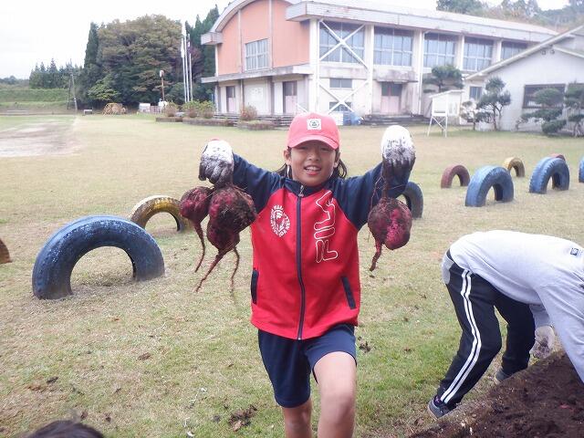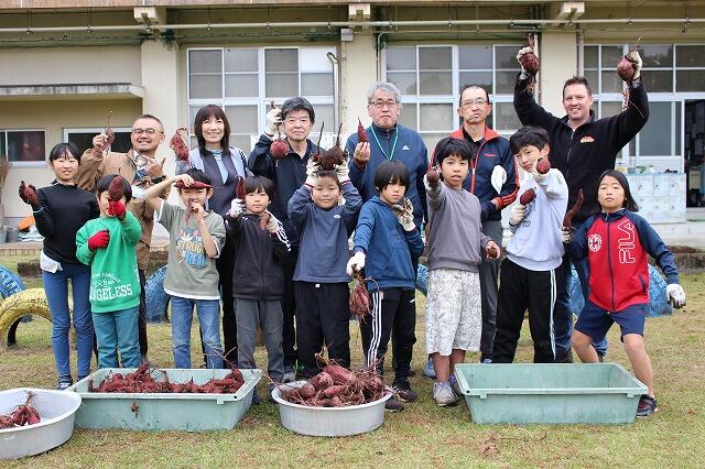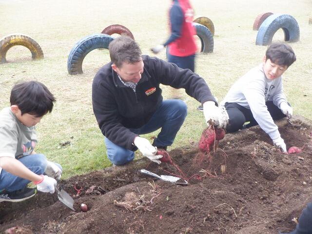 いも掘りには、ALTのジェイク先生も参加してくれました。収穫するサツマイモの品種は、紅はるかとシルクスイートです。子どもたちは、取り残しのないように土の中をくまなく掘って、いもを探しました。