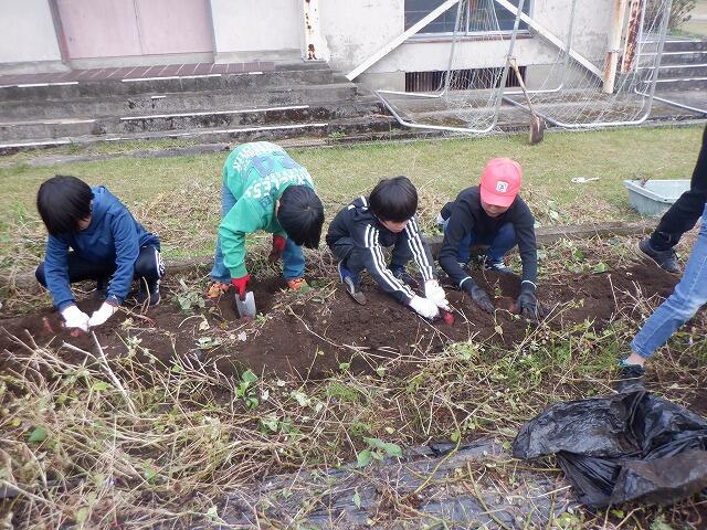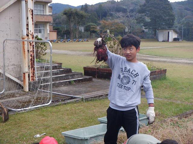 サツマイモは、職員室側と体育館側の2カ所の花壇で栽培しましたが、職員室側の花壇の方が大きいいもがとれました。サイズや形の違ういもが出てくるので、子どもたちも楽しそうででした。
