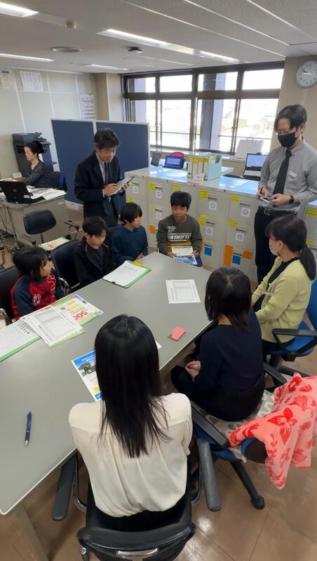 都城市役所までは、市のマイクロバスを利用して行きました。サポートセンターでは、吉之元への移住者を増やすために移住状況や定住する人の空き家の活用具合などを質問して、今後の活動に必要な情報を集めることができました。この後、子どもたちは調べて結果をまとめて次の活動へつなげていく予定です。御協力いただいた移住・定住サポートセンターの皆さん、本当にありがとうございました。