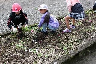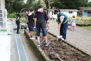 各学級の花壇に花を植える準備を全校児童で行いました。