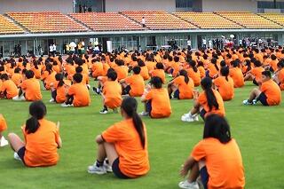 お弁当を食べて午後からは、都城市の6年生みんなで令和9年に宮崎で開催される「日本のひなた宮崎国スポ・障スポのPR動画撮影」に参加しました。大会イメージソング「ひなたのチカラ」に合わせて精いっぱい踊りました。