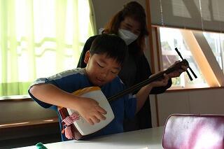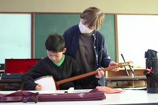 いつも御指導いただいている山下先生に三味線のルーツや演奏の仕方などについて教えていただいて、実際に三味線で「さくら」を演奏する練習をしました。三味線の楽譜の読み方が分かると、子どもたちは、練習を繰り返し音楽を奏でることができるようになり、音を楽しむ体験をすることができました。