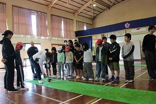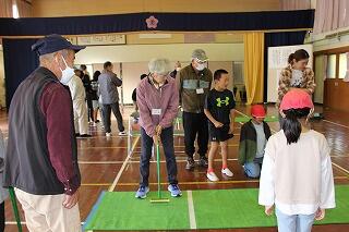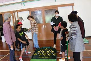子どもと保護者や地域の方々の混合チームを作り、3か所に分かれて、点数を競いました。一度練習をして競技を始めると、何度も打ってみたくなった子どもたちでしたが、順番を決めてみんなが平等に打ち進め、ルールを守って競技を楽しみました。玉の行方をじっと見つめ「入れ、入れ!」と大きな声で互いに応援し合い、賑やかで楽しい体験活動になりました。