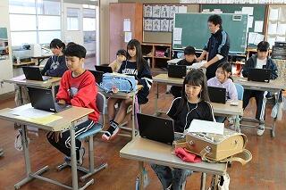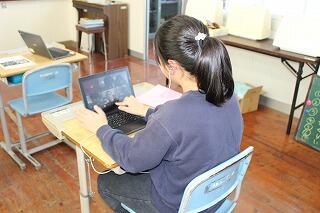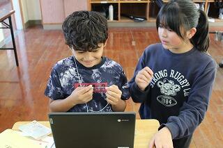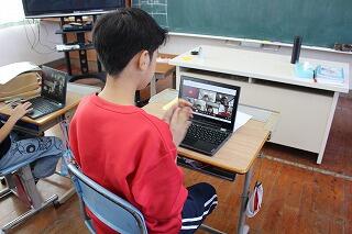 各自教室でタブレットを開き、イヤホンをして高学年が班長の5つの班に分かれて行います。