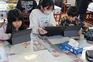他のテーブルでは、タブレットを開き宿題やお絵描きを始めました。6年生の横に下学年の子が座り、とても仲良く会話をしながら始めていました。