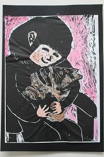 猫を大事そうに抱きかかえ、にっこりとほほ笑む表情から優しい愛情が伝わってくる作品です。彫りや印刷、色付けの細部にわたって丁寧に仕上げていることを認められて大変うれしかったようでした。